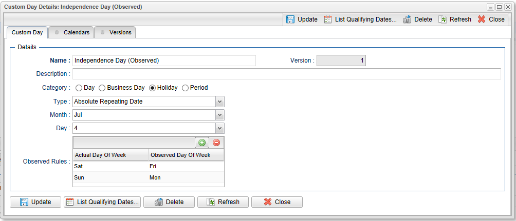 B-06728 | Calculate Observed Public Holidays | This provides the ability to support "observed" public holidays without the need for a custom day list of dates. For example if July 4th falls on a Saturday the observed July 4th would be Friday July 3rd and if July 4th falls on a Sunday the observed July 4th would be Monday July 5th.