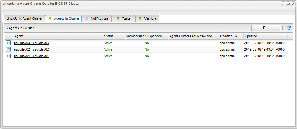 B-04367 | Add Cluster Broadcast for UDM File Transfer Tasks Utility Agent | File Transfer Tasks using the UDM Transfer Protocol now support the Agent Cluster Broadcast functionality for the Tasks Utility Agent. For Example, a Linux/Unix Agent Cluster contains the following three Agents: