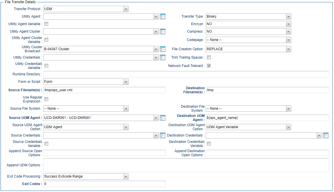In order to configure a UDM file Transfer Task to transfer files from agent UCDDKR001 - UCDDKR001 to each of the Agents in this Agent Cluster, you would configure the UDM file Transfer Task as follows: