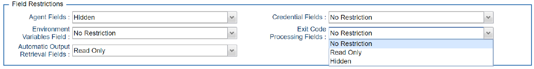 B-09484 and B-09507 | Read Only & Hide options for Universal Template Fields | Customers now have the ability to deliver Universal Tasks that have certain defaulted fields marked as Read Only or completely Hidden from the end user. For example, if a specific Universal Task can run only on a Specific Server with a Specific Credential, the Universal Template Administrator now can Hide these fields in the Universal Task or mark these fields as Read Only. The default fields will be grouped at a high level for visibility purposes; each group can be restricted only as a whole: The following options are available for each of the above Field Groupings: