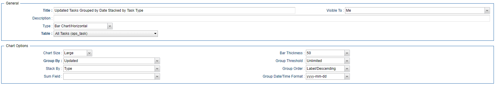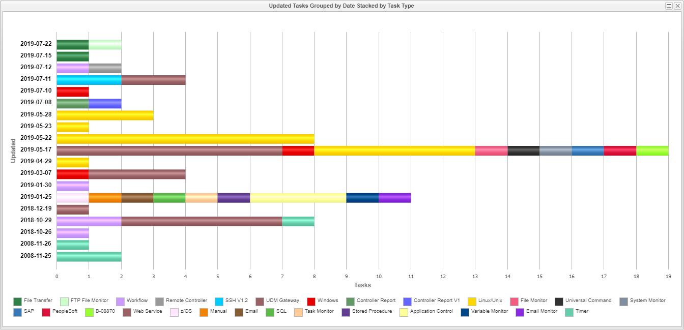 B-10376 | Report Chart Group by for Date/Time fields to specify Range of Grouping | Previously report charts that grouped data by any of the available date/time fields based the grouping on the way the date/time field is stored in the database (typically at the millisecond level). This enhancement allows for the creation of more meaningful reports that can group chart data with the following levels of granularity: For example, the following report shows the number of Task Definitions updated each day stacked by the Task Type: