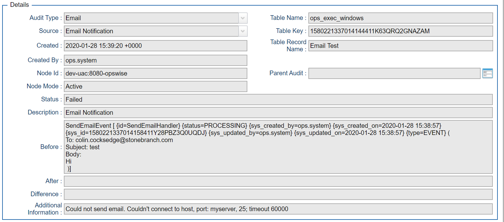 B-08452 | Audit Email Notification Actions | Customers now have the option to Audit the status of "Task Email Notification Actions" and "System Notifications". The status of emails that are sent from Task Email Notification Actions and as System Notifications were previously only visible in the "opswise.log", a new system property has been added to allow customers to audit all notifications or just failed notifications. This option provides enhanced visibility in situations where these notification emails have failed to successfully send.