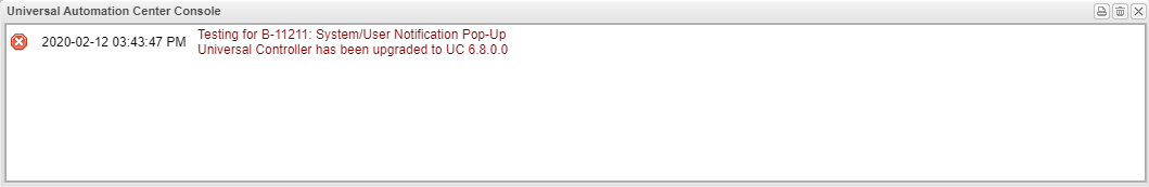 When a user logs into the Universal Controller the defined message will be displayed in the "Console" window, the console window will need to be manually closed by the user.