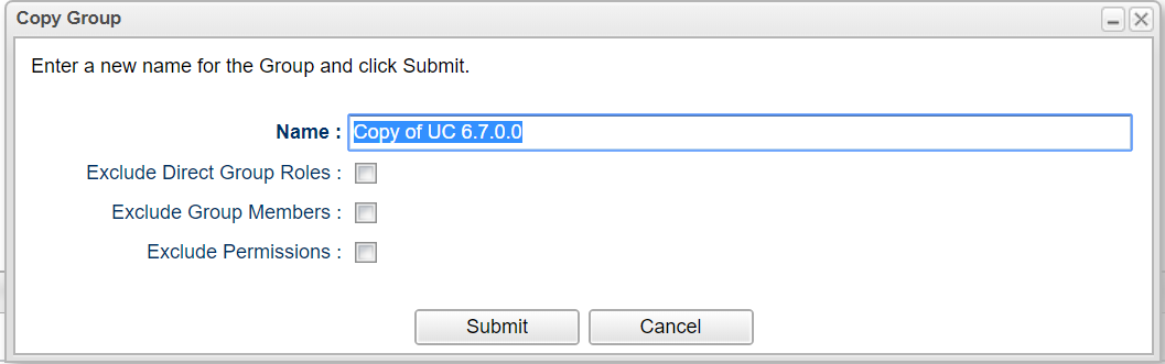 The Group copy function allows the user to specify which elements of the existing Group are used to create the new Group. By default all of the exiting Groups elements are copied, during the copy the user can specify the new Group’s name and whether to exclude (not copy) Group Roles, Group Members, and or Group Permissions.