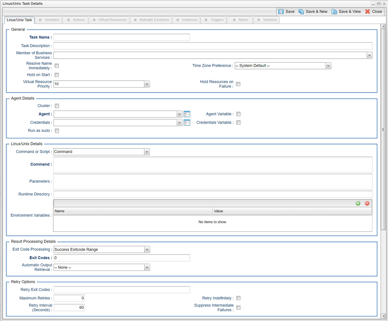B-11475 | Move Task Exit processing options to new section | For all applicable tasks the Exit and Result processing options have been move to a new Result Processing Details section of the task definition and instance forms.