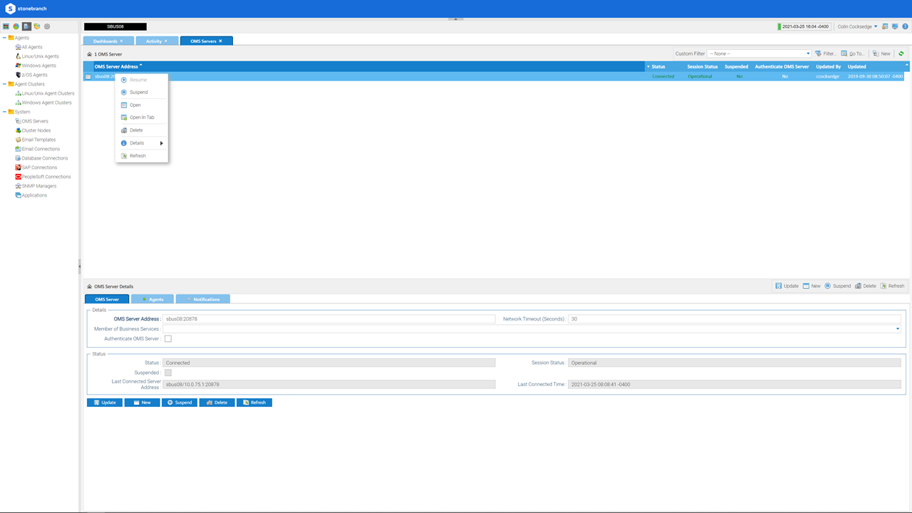 B-03852 | Allow Controller OMS Server to be suspended & resumed from the UI | Users can now suspend and resume OMS Servers with a right click option on the OMS Servers listed in the Agents and Connections / System / OMS Servers list.
