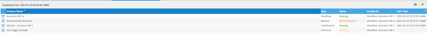 E-01495 | View Blocking Ancestors (i.e Blocking Jobs) | To assist in analysis of why a task is waiting the Activity, Task Instances, and Workflow Monitor displays provide a new right click option to View Blocking Ancestors for task instances that are in a workflow and have not started (i.e. Defined, Waiting or Held status). Previously, when viewing dependencies for a task instance using View Predecessors/Successors, only direct predecessors within the same workflow are listed. View Blocking Ancestors traverses the workflow hierarchy to list all the blocking ancestors of the task instance. Once selected the following dialog will be displayed: