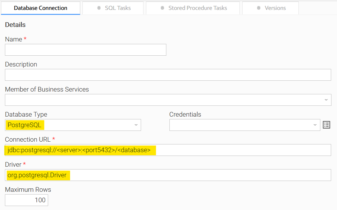B-02980 | PostgreSQL "Database Type" for Database Connections. | From the Database Connection form, a new PostgreSQL option is available from the Database Type drop-down. When selected, the form will be pre-populated with a template Connection URL and a Driver for PostgreSQL.