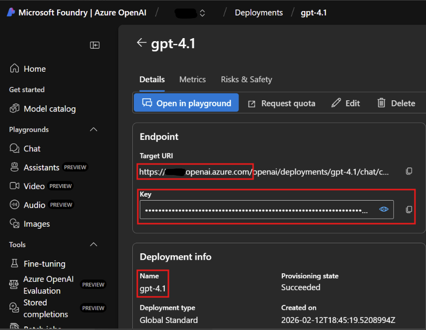 In Azure Foundry, go to Deployments, then view the details of your chat (gpt-4.1) model.