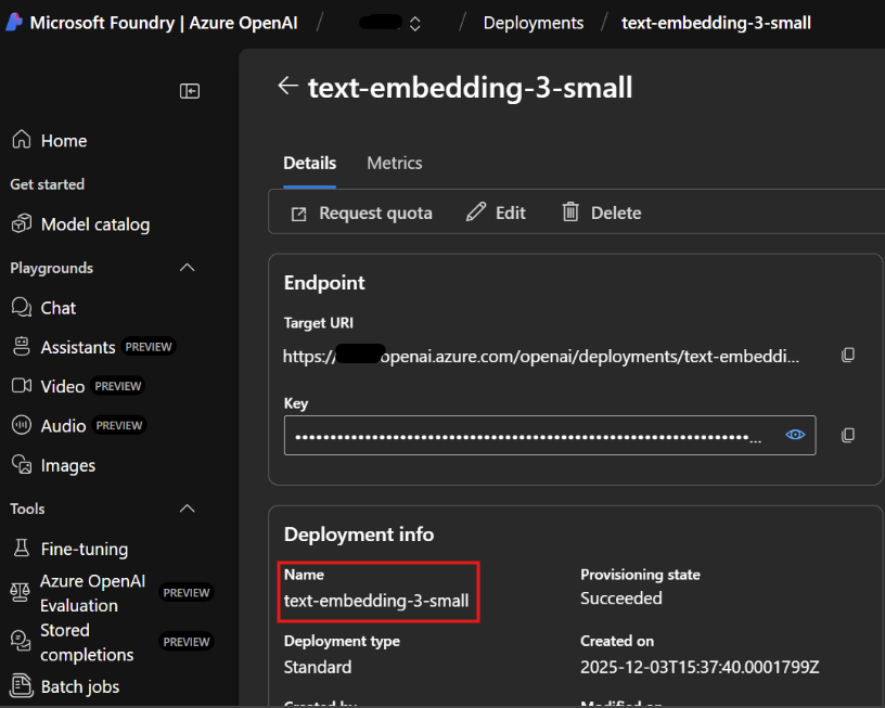 text-embedding-3-small. - From the deployment detail page, note your Endpoint URL and API Key, and the Deployment Name of each model.