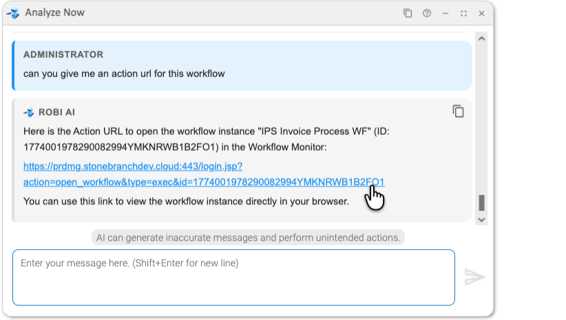 In addition, if we need to involve another team member in this resolution, we could ask Robi AI to create a link (Action URL) to the workflow instance.