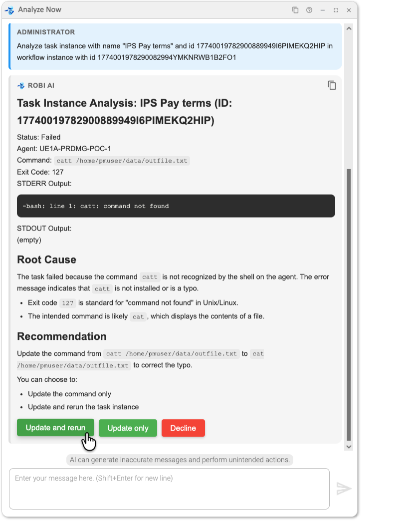 Robi has identified a permission problem, which needs to be fixed by an OS administrator. It then shows us the OS command we need to resolve it, and offers to rerun the task for us once we have fixed the problem.
