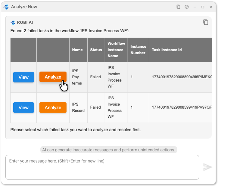 We want Robi AI to analyze the issue for a failed workflow.