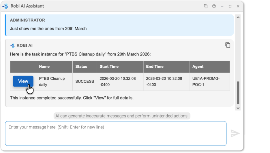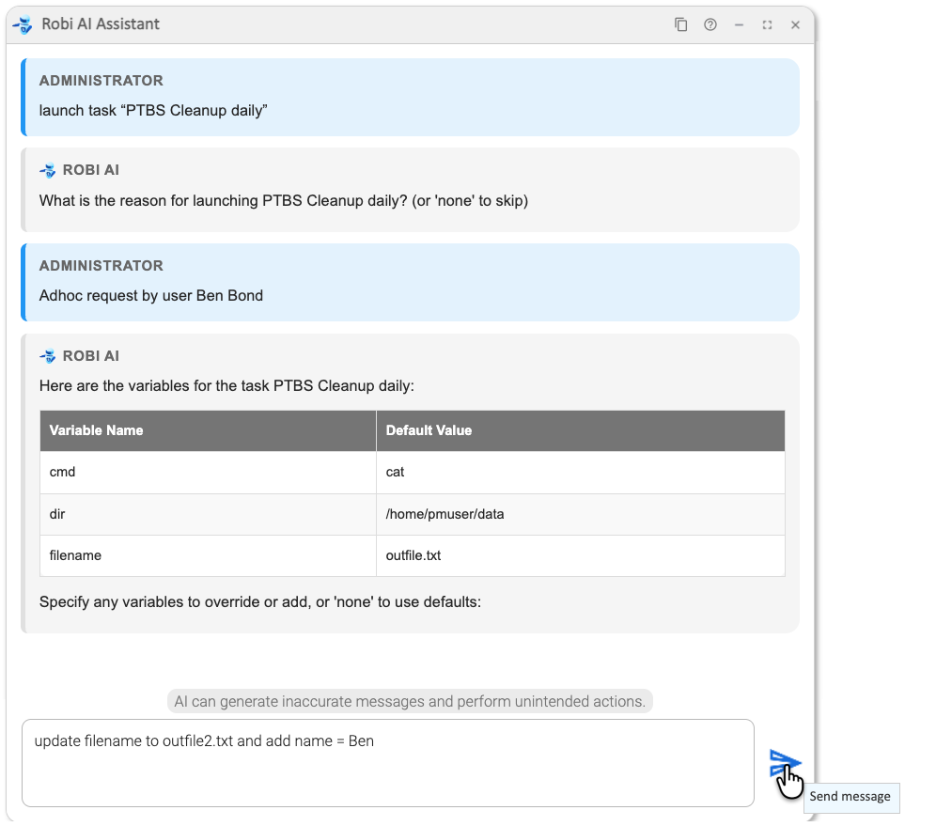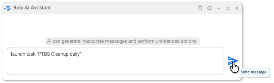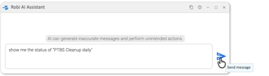First, we ask Robi AI Asisstant to launch a task called "PTBS Cleanup Daily".