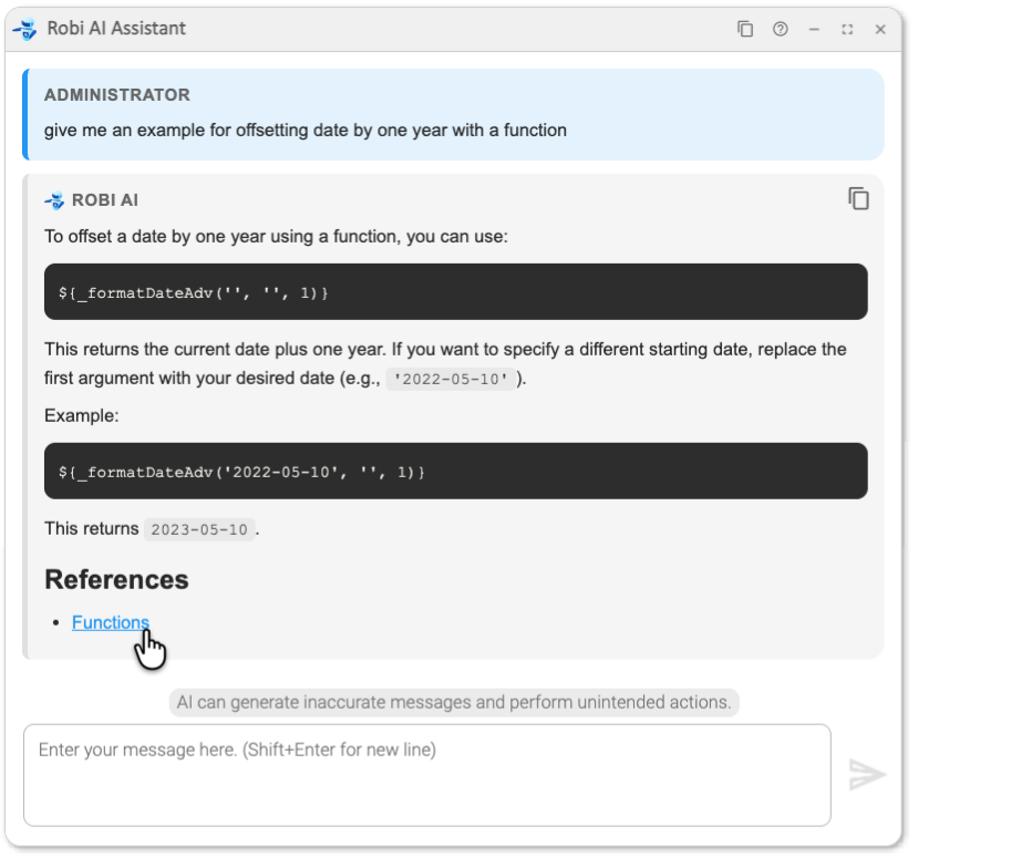 The AI Assistant takes several prompts into context when answering the user. Besides reading the user's prompt, Robi also takes into account a system prompt which describes its basic purpose (i.e. Robi knows it is meant to assist with using UAC). This means Robi may refuse to answer a question if the prompt is deemed irrelevant to its purpose, such as "Tell me about the stock market."