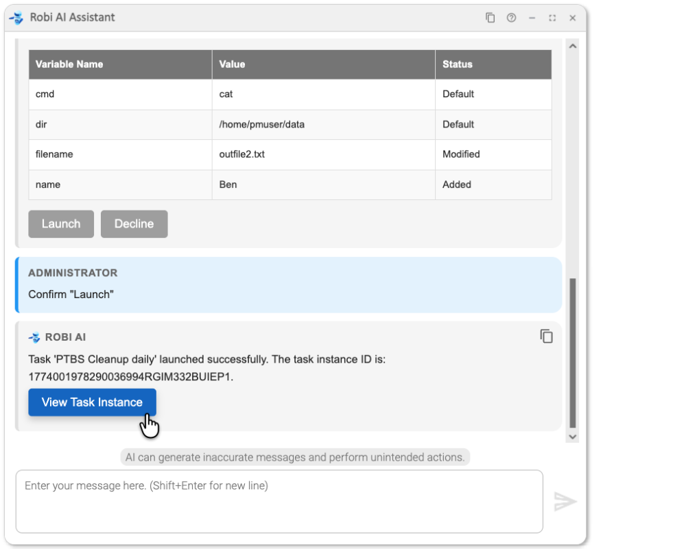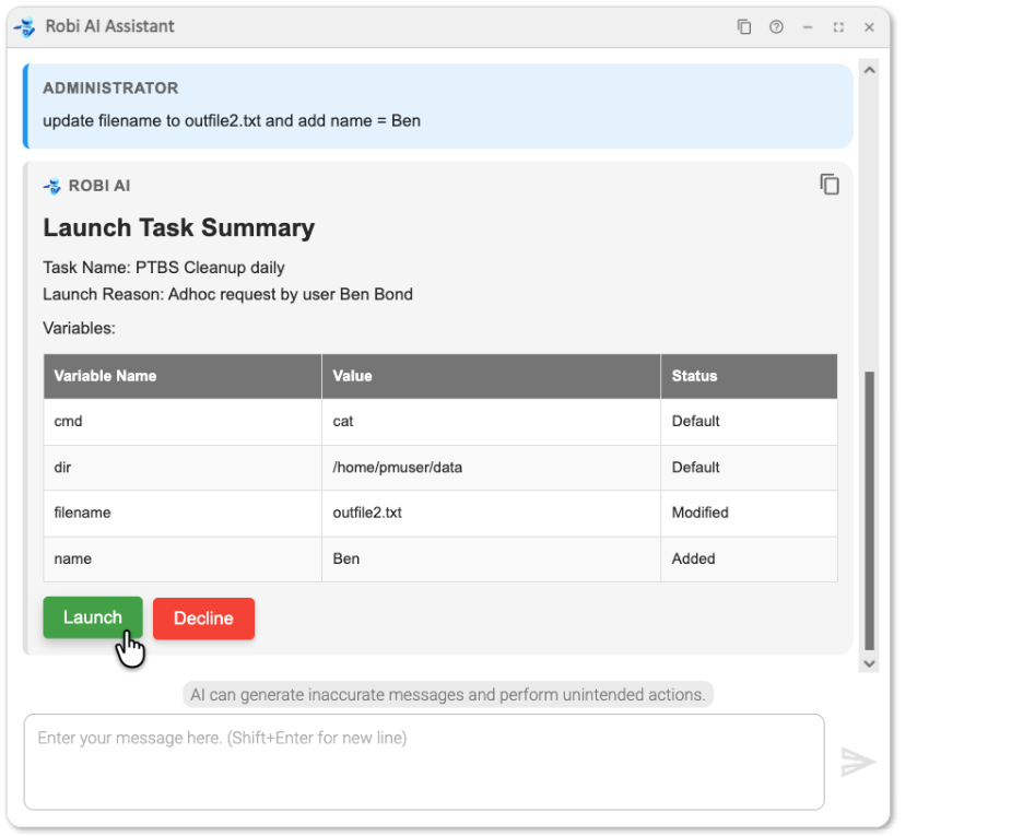 Robi AI displays the variables that will be used and asks if we would like to Launch the task or Decline.
