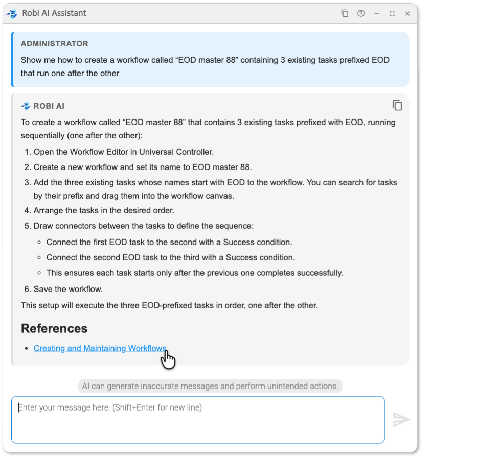 The prompt starts with "Show me", so Robi knows we are asking for help. It then gives step-by-step instructions for creating the workflow. Robi draws on product knowledge from the docs (with a link to the References), while using our prompt to give specific details matching our requirements.