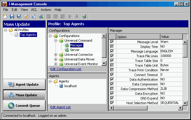 The Profile tree section of the Mass Update screen identifies all of the profiles for which the current user (resident on UEC) has configuration access.