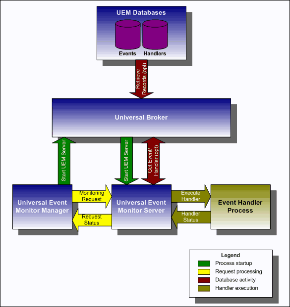 The following figure illustrates the interaction of the Universal Broker and the Universal Event Monitor components involved when a UEM Manager is executed.