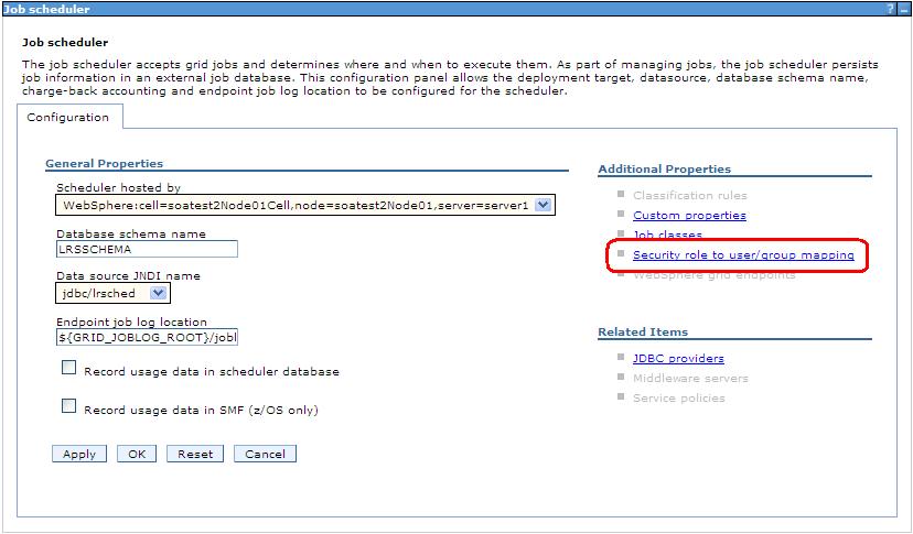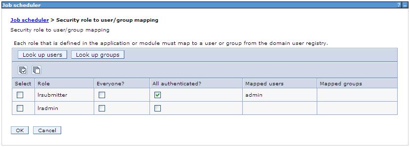 Assign WebSphere users to lrsubmitter or lradmin (or other job scheduler users if you have created them). Make sure the All authenticated? checkbox is checked.