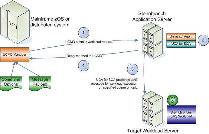 Universal Command Agent for SOA: JMS Connector publishes the workload execution message to the specified queue or topic.