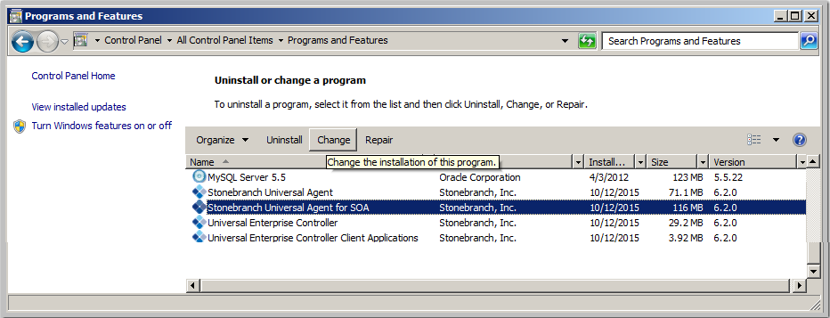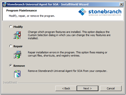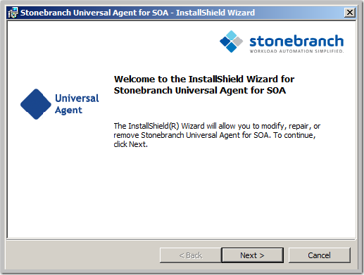 From the list of installed programs, select Stonebranch Universal Agent for SOA and click the Change button to start Windows Installer. The Welcome dialog displays.