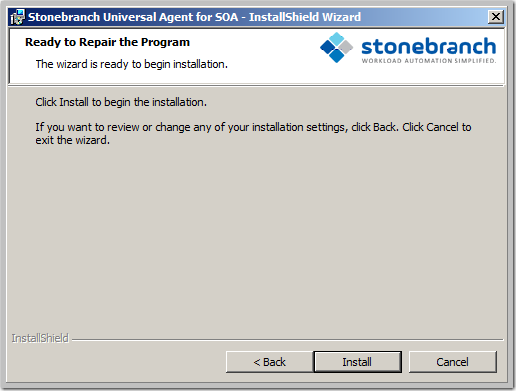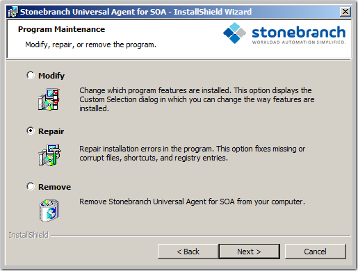 The installation program has the ability to recover accidentally deleted application files, configuration and component definition files, or registry entries required by Universal Agent for SOA. This repair feature will re-install the missing items, making a complete re-install unnecessary.