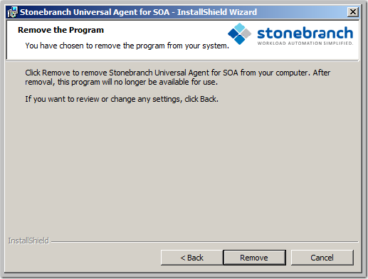 Before deleting the entire .\Universal directory, make sure it does not contain application files for any other installed Stonebranch, Inc. product. (See Universal Agent for SOA for Windows - File Inventory Lists for a list of files and directories installed with Universal Agent for SOA.)