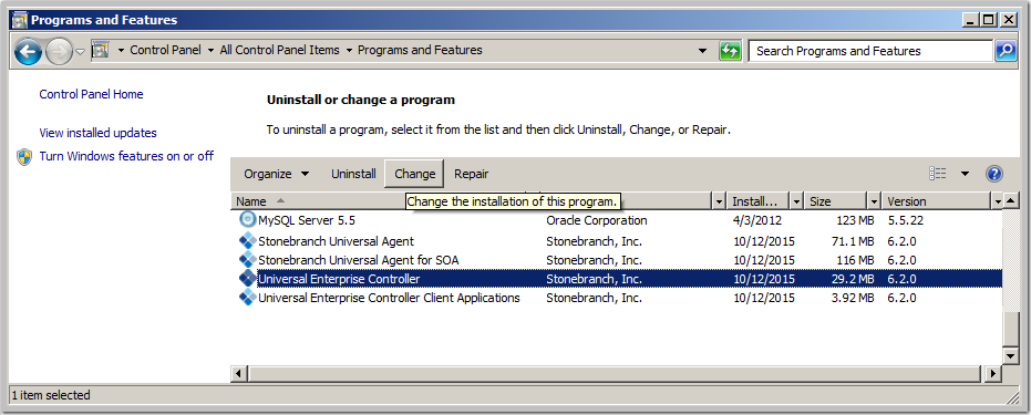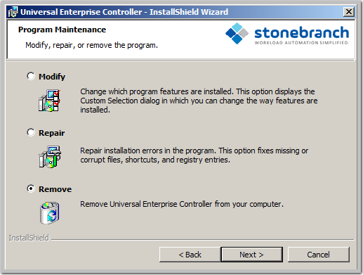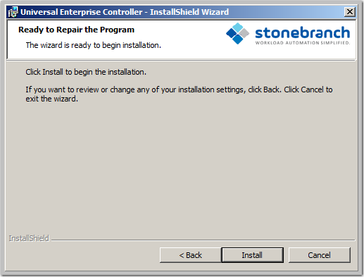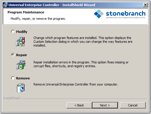 Windows Installer has the ability to recover accidentally deleted application files, configuration files, or registry entries required by Universal Enterprise Controller. This repair feature will re-install the missing items, making a complete re-install unnecessary.