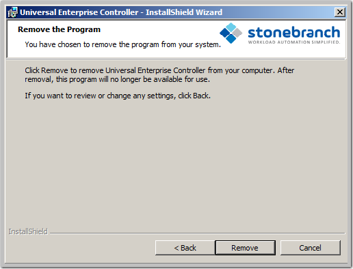 In addition to those files and directories created by the Universal Enterprise Controller installation, there may be some shared files left behind following an uninstall. These components will be removed when the last Stonebranch Inc. product that uses them is uninstalled.