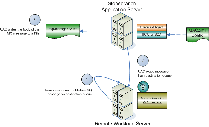 It consists of a remote application workload publishing an MQ message using the MQ protocol to a specified destination queue hosted by the MQ provider. The MQ provider, which hosts the queues that represent the MQ destination, can be located on a remote application server or on the local application server that hosts Universal Event Monitor for SOA.