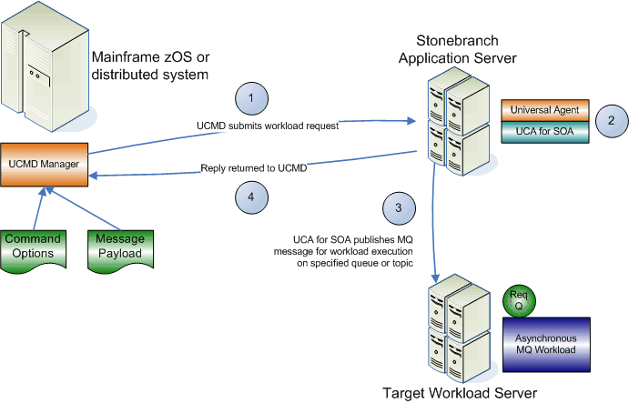 Step 3 | Universal Command Agent for SOA: MQ Connector publishes the workload execution message to the specified queue. |