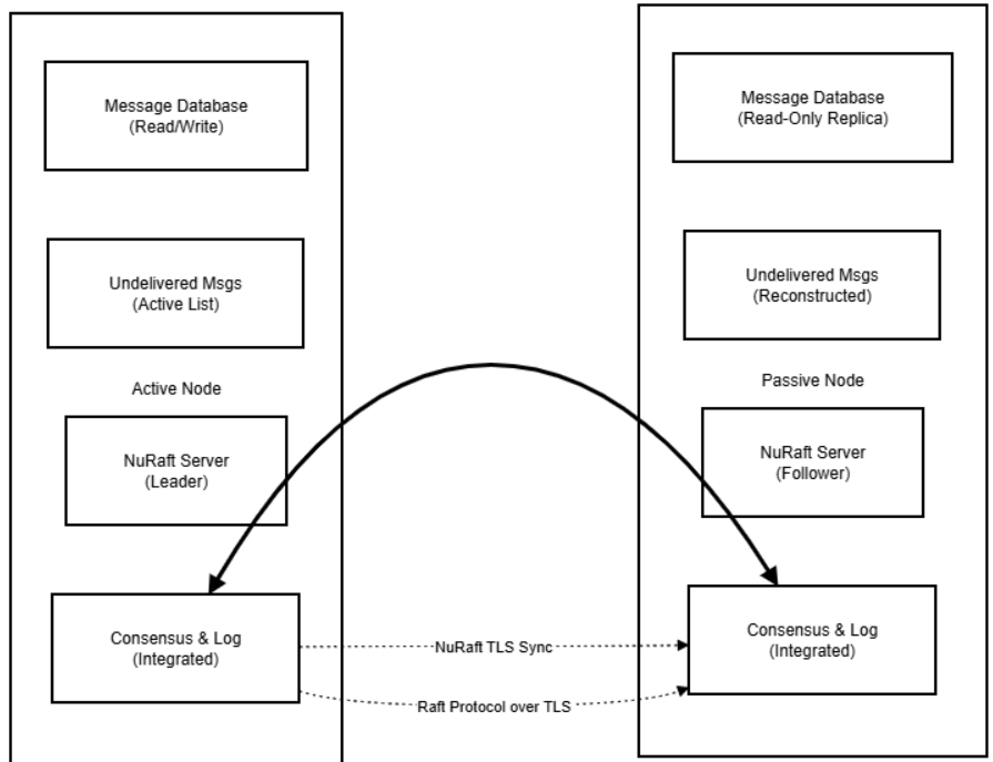 The NuRaft Consensus Log is a single distributed log managed by NuRaft across all cluster nodes. It contains all the application’s operations that need to be replicated. It provides both consensus and replication functionality. Entries are applied into the message database via the state machine interface.