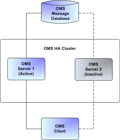 An OMS HA cluster consists of one active OMS Server and one or more inactive (passive) OMS Servers sharing a common OMS message database. OMS clients are configured with a list of OMS server addresses, one address for each OMS Server in the HA cluster. If the active OMS Server become unavailable, one of the inactive OMS Servers automatically assumes the role of the active OMS Server. OMS clients detect that the original active OMS Server is not available and automatically fail-over to the new active OMS Server. The shared OMS message database Ensures that no messages are lost when there is a change in the active OMS Server.