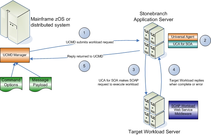 Step 3 | Universal Command Agent for SOA: SOAP Connector sends the workload execution message via SOAP and blocks for the reply. |