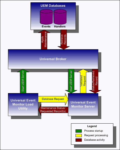 The following figure illustrates the interaction of the Universal Broker and the Universal Event Monitor Server components involved during the execution of UEMLoad.