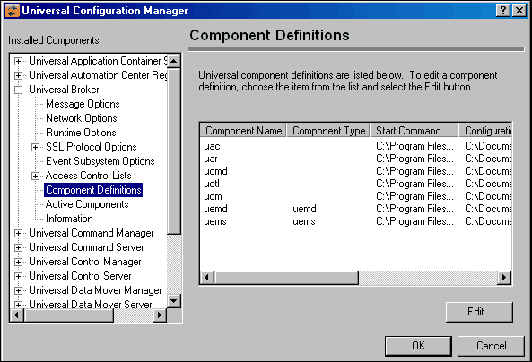 The component definitions for all Universal Agent components are identified in the Component Definitions property page of the Universal Broker.