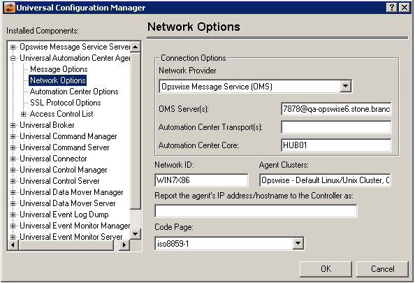Specifies the port and network address of an Opswise Message Service (OMS) Server that the agent will use for communication with an Opswise Controller. This value is required if the Opswise Message Service network provider is chosen in the list above.