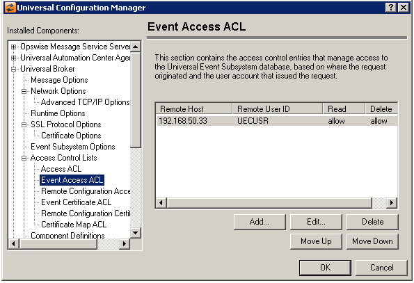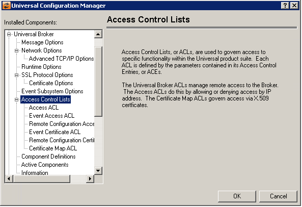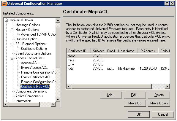 Edit Button | Displays a dialog that allows the selected Access Control List entry to be modified. Certificate ID Universal Broker Config Access |