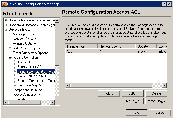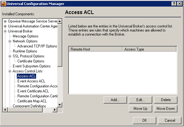 Access Control List | Displays the entries contained in the Universal Broker Access Control List (ACL). This list is used to grant or deny access to Universal Broker based on the remote system's IP address. The order in which ACL entries are evaluated and applied are based on their position in this list. Use the Move Up and Move Down buttons to change an entry's priority. |