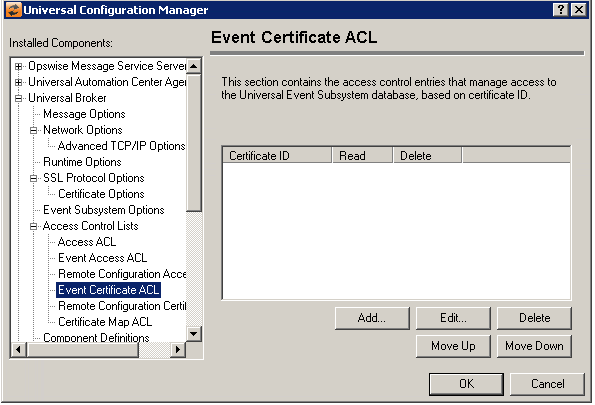 Add Button | Displays a dialog box that allows an entry to be added to the Access Control List. The fields in this dialog are populated with default values. Certificate ID Universal Event Subsystem Access |