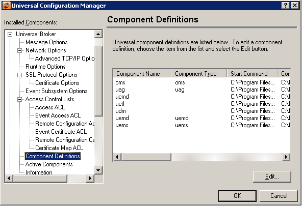 Edit Button | Displays a dialog box that is used to modify an existing component definition. Start Command Configuration File Working Directory Maximum number of component instances |