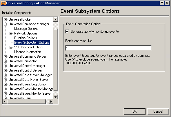 Event Generation Options | Generate activity monitoring events Persistent event list Enter a list and/or range of numeric event types, separated by a comma. To exclude an event or range of events, precede the entry with an upper- or lower-case 'X'. Use an asterisk (*) to specify all event types. For example: