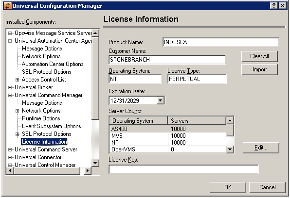 Server Counts | Contains the number of Universal Command Servers you have licensed, by operating system. This values in this list should match the numbers specified in the licensing material you received with your software. |