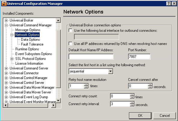 Universal Broker connection options | Use the following local interface for outbound connections Use all IP addresses returned by DNS when resolving hostnames Default Host Name/IP Address Port Number Select the first host in a list using the following method Retry host name resolution Cancel connect after | |