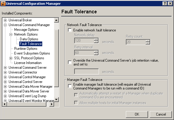 Network Fault Tolerance | Enable network fault tolerance Network Delay Retry Count Retry interval Override the Universal Command Server’s job retention value |