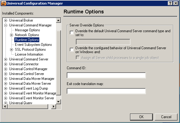 If the default command type you wish to use is not shown in this, you may still enter it here. The value will not be validated until it is sent to the Universal Command Server. Override the configured behavior of the Universal Command Server on windows and: Assign all Server child processes to a single job object |