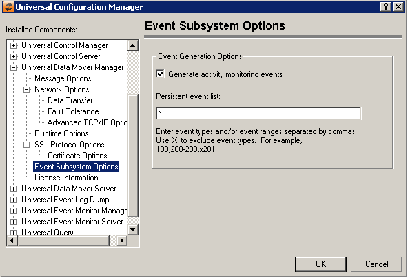 Event Generation Options | Generate activity monitoring events Persistent event list Enter a list and/or range of numeric event types, separated by a comma. To exclude an event or range of events, precede the entry with an upper- or lower-case 'X'. Use an asterisk * to specify all event types. For example: