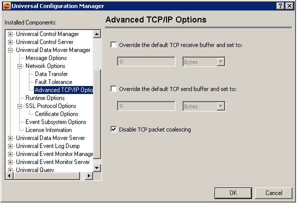 Disable TCP packet coalescing | Select this option to disable the TCP packet coalescing algorithm (that is, Nagle algorithm). When this option is unchecked, the default TCP implementation is used, which may or may not disable the algorithm. Exercise caution when changing this option, as it could have a significant performance impact. See the tcp_no_delay configuration option in the UDM Reference Manual for more information. This option is checked by default. |