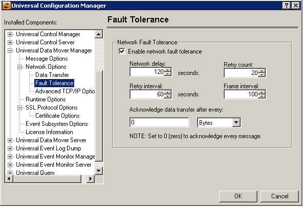 Network Fault Tolerance | Enable Network Fault Tolerance Network Delay Retry Count Retry Interval Frame interval Acknowledge data transfer after every The format of the value is nnnnb, where 'nnnn' is a numeric value and 'b' is one of the following optional unit specifiers: